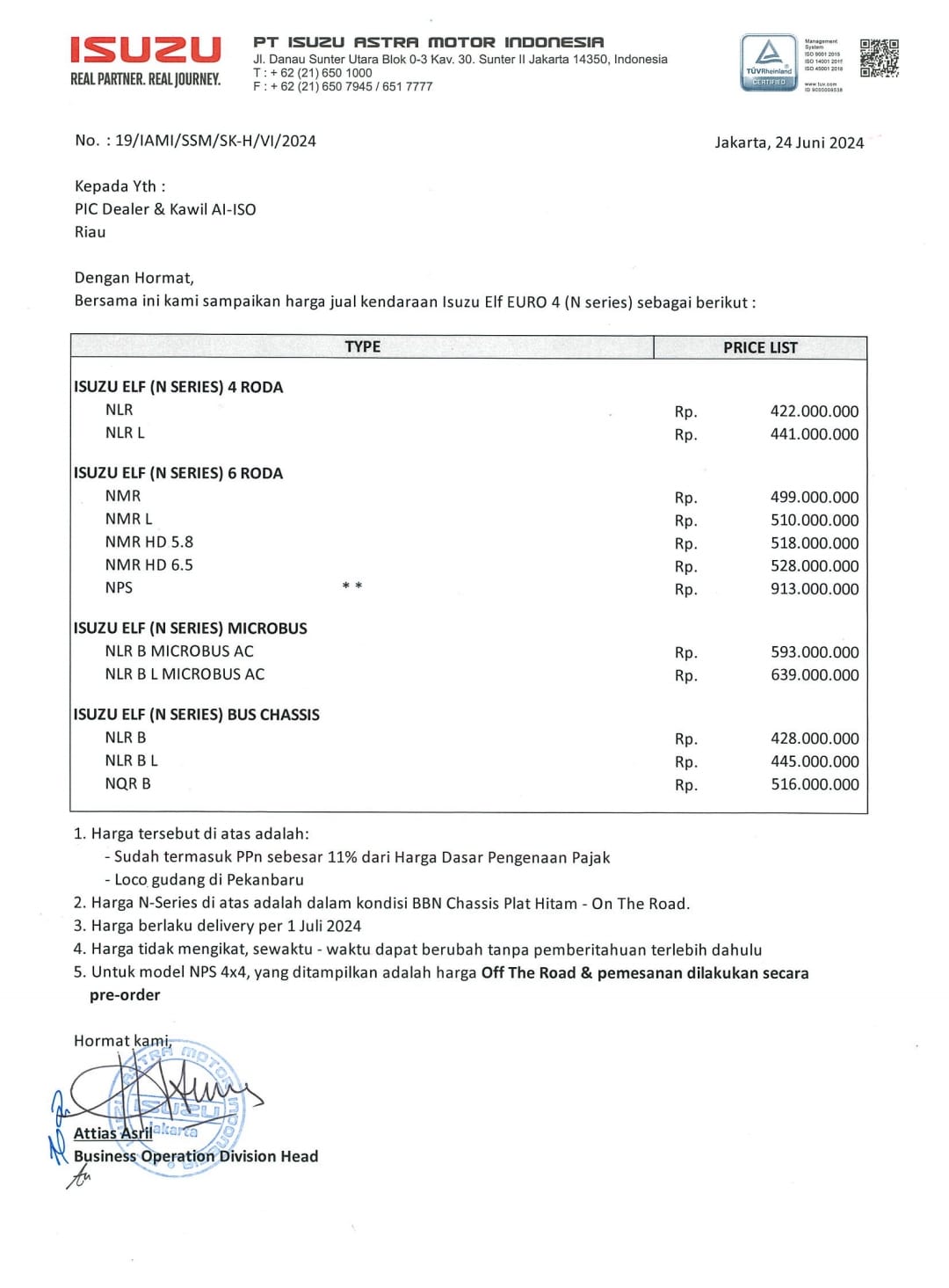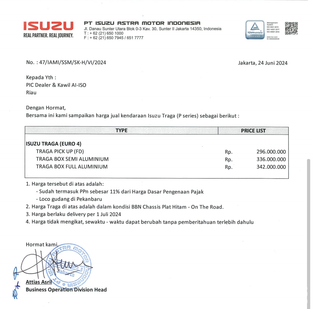 Perkenalkan saya sales Isuzu Pekanbaru, ingin membantu dan menawarkan produk kami kepada Bapak/Ibu, tentunya penawaran harga promo kredit cicilan yang terbaik. Promo bunga 0%, DP minim, atau angsuran cicilan ringan.